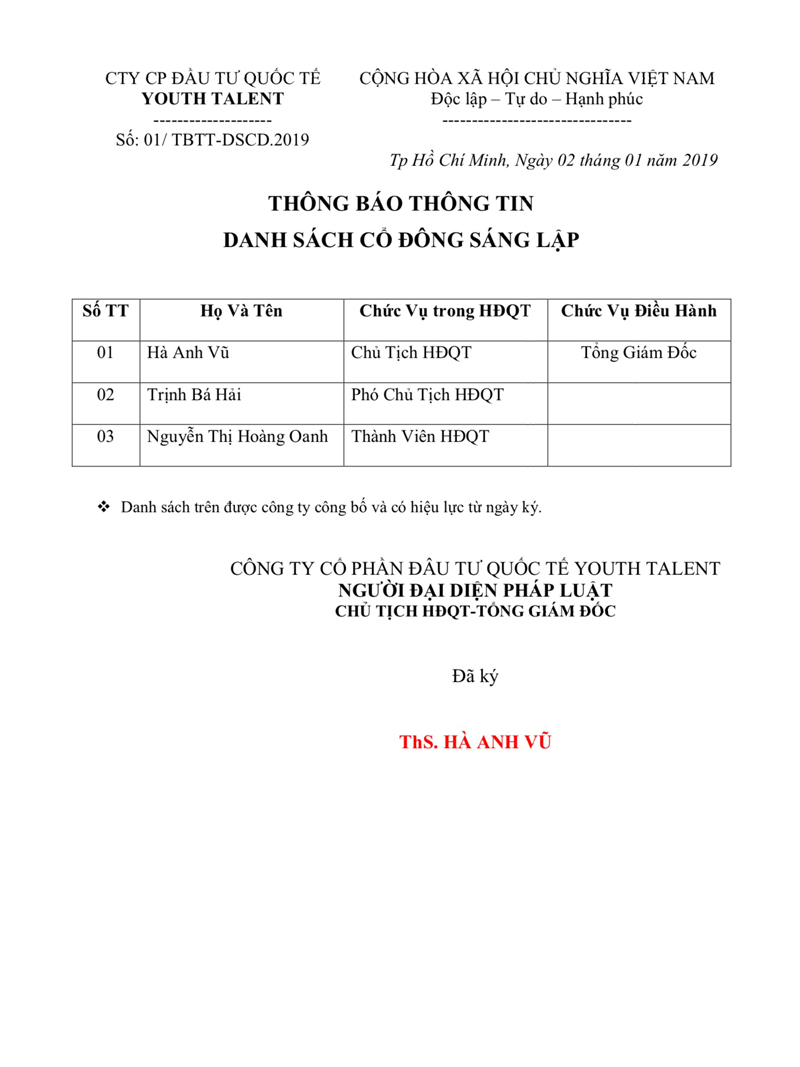 - Giấy phép kinh doanh CÔNG TY CỔ PHẦN ĐẦU TƯ QUỐC TẾ YOUTH TALENT
